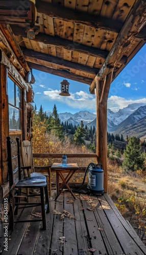 Fototapeta premium Rustic Mountain Cabin Porch with Portable Water Filter Amid Scenic Mountain Views