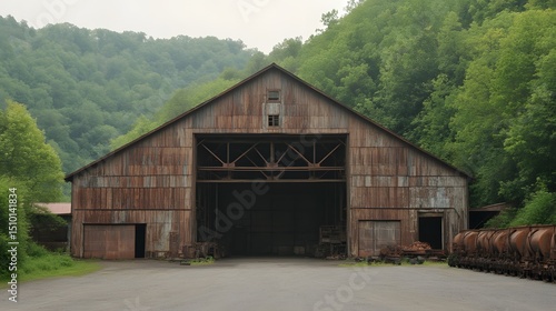 © Sumon, Obraz premium Rustic Old Barn in Green Forest Landscape