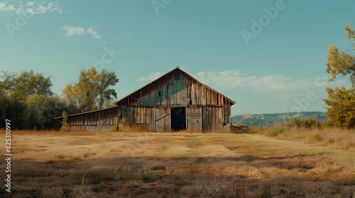 © KHF, Obraz premium Rustic old barn surrounded by grassland and forest landscape.
