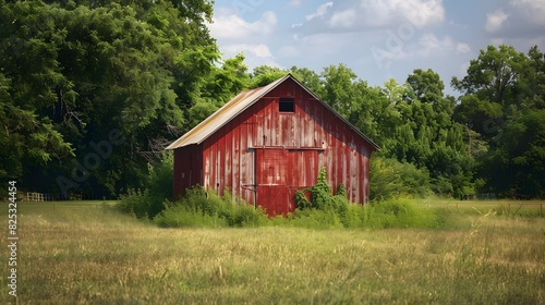 Obraz premium Rustic old barn surrounded by grassland and forest landscape.