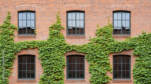 Fototapeta premium Rustic old brick warehouse exterior with ivy-covered walls, blending...