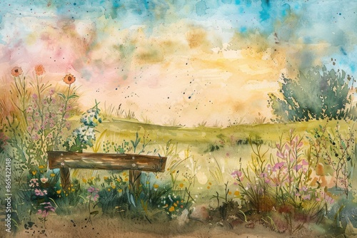 © Yevhen, Obraz premium Rustic Pasture View. Floral Meadow Landscape with Wooden Plank Background