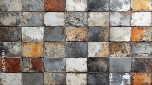 Fototapeta premium Rustic patterned wall with weathered tiles in various earthy tones and textures