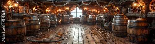 Fototapeta premium Rustic pirate ships galley, wooden barrels and ropes, warmly lit by lanterns,...