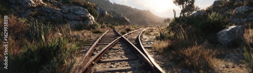 Fototapeta premium Rustic railroad tracks diverge through a sun-drenched mountainside