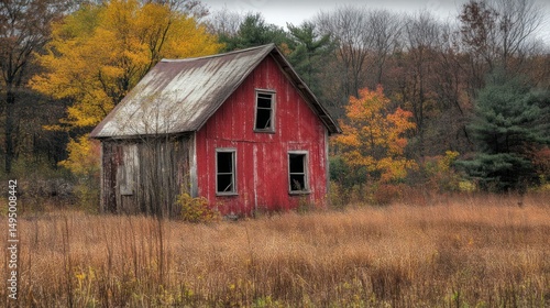 © Efi, Obraz premium Rustic red abandoned house, autumn field, forest background, fall scenery, nature photography