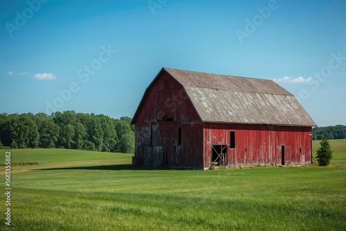 © vxnaghiyev, Obraz premium Rustic Red Barn Amidst Countryside Scenery