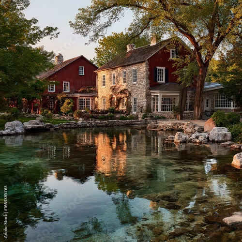 Obraz premium Rustic Red Barn Beside Pond At Sunset