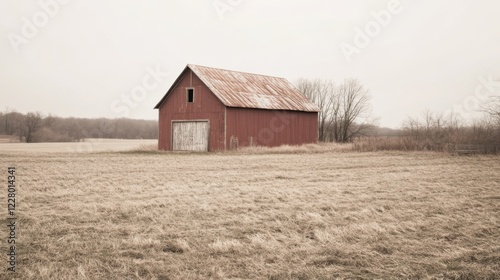 Obraz premium Rustic red barn in a desolate winter field.