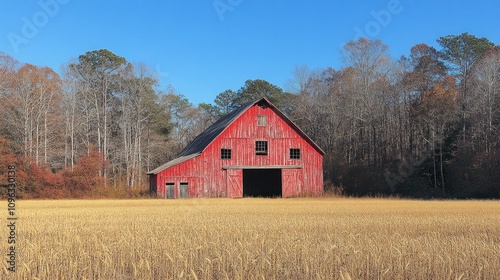© Muamanah, Obraz premium Rustic Red Barn in Golden Field