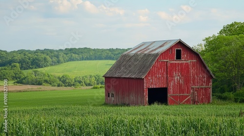 © Kitta Studio, Obraz premium Rustic Red Barn with Peeling Paint Surrounded by Green Fields and Trees Under a Blue Sky in a Scenic Rural Landscape