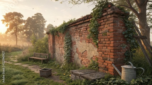 Naklejka premium Rustic Red Brick Wall Surrounded by Ivy in Misty Garden at Sunrise