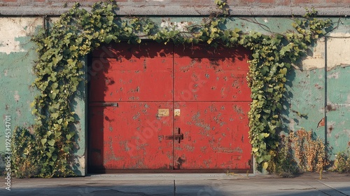 © akun, Fototapeta premium Rustic Red Garage Door Covered in Green Vines.