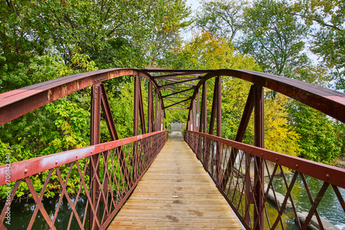© Nicholas J. Klein, Obraz premium Rustic Red Truss Bridge with Autumn Foliage in Rural Indiana