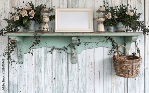 Naklejka premium Rustic shelf with flowers, frame, and basket.