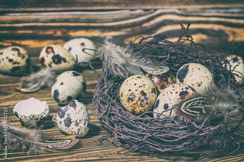 © rustamank, Obraz premium Rustic still life - quail eggs in nest on rough concrete surface, , rustic background. Easter still life, postcard.