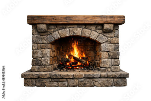 © Krtola , Fototapeta premium Rustic stone fireplace with a burning fire, offering warmth and a cozy atmosphere, featuring a wood mantel on transparent background