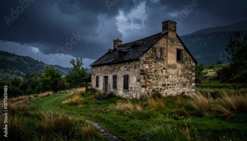 © Muhammad, Obraz premium Rustic stone house in moody landscape architecture and nature