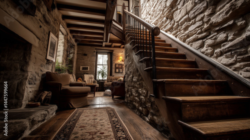 Obraz premium Rustic Stone Living Room With Wooden Staircase
