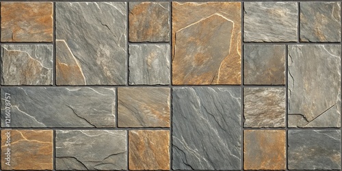© Theerawat, Fototapeta premium Rustic Stone Tile Wall Texture A Seamless Pattern of Irregularly Shaped, Earthy Tones for Design Projects