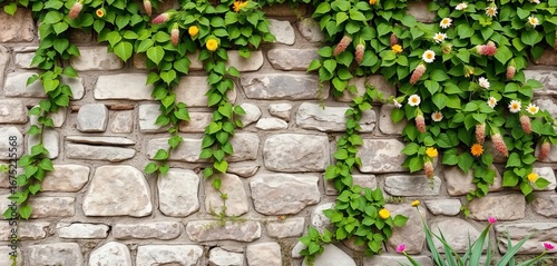 Naklejka premium Rustic stone wall backdrop, overgrown with ivy and wildflowers, plants, image