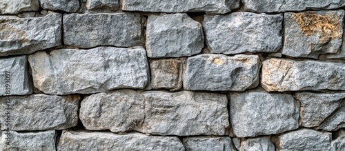 Fototapeta premium Rustic stone wall texture with irregularly shaped grey stones in a horizontal pattern