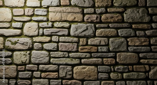 Fototapeta premium Rustic stone wall with moss creating a textured natural background for architecture, construction, or landscaping projects adding depth and organic beauty