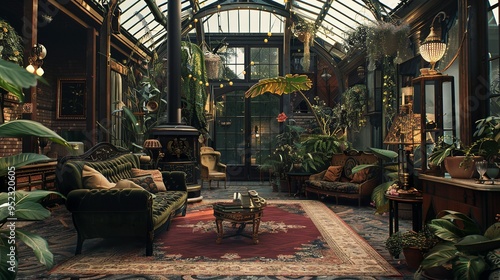 © Nordiah, Naklejka premium Rustic style greenhouse living room interior design with cozy ambience