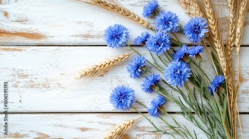 Obraz premium Rustic summer composition with blue cornflowers and wheat on wooden background