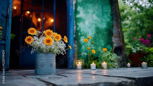 © BOJOShop, Fototapeta premium Rustic Sunflower Wedding Backdrop Flowers Candles Vintage Door