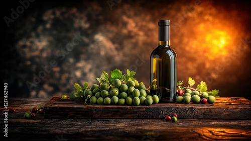 © AGUNG, Fototapeta premium Rustic table, olives, wine bottle, sunset, food & drink advert