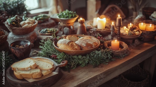 Naklejka premium Rustic Table Setting Featuring Bread and Candles