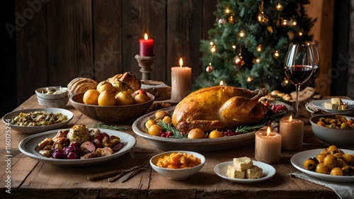 © DesignAwork, Naklejka premium Rustic Table with Gourmet Holiday Feast Thanksgiving country dinner breakfast lunch healthy food event celebrate christmas holiday food.