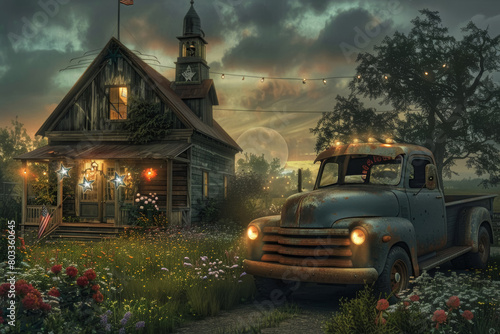 © spyrakot, Fototapeta premium Rustic Temple with Vintage Truck on Fourth of July