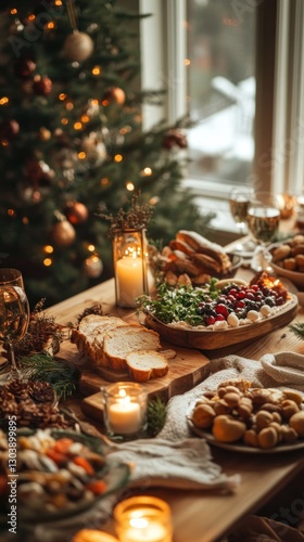 © suphamit, Naklejka premium Rustic Thanksgiving setup with warm lighting, cozy blankets, and holiday-themed dishes