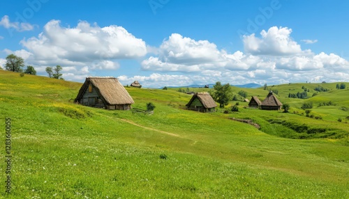 © Yopi, Obraz premium Rustic Thatched-Roof Houses on a Lush Green Hillside Under a Sunny Sky