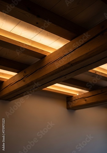 © Sugedang, Fototapeta premium Rustic timber beams with subtle ambient lighting, providing warm glow