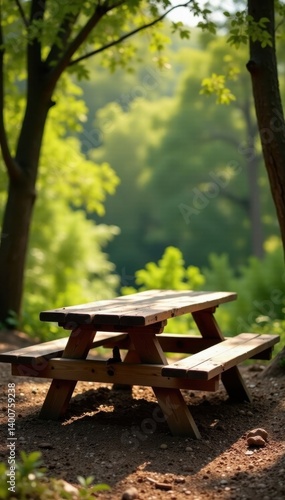 Naklejka premium Rustic timber picnic table, native bush backdrop, sunny, tranquil, trees