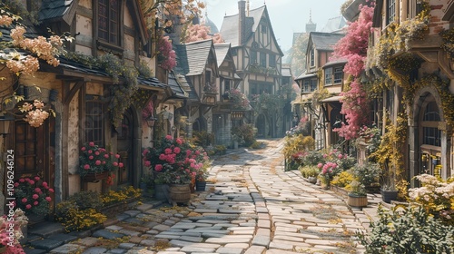 © Xabrina, Fototapeta premium Rustic village street with half-timbered houses adorned with flowers and lanterns in a tranquil medieval-inspired countryside setting.