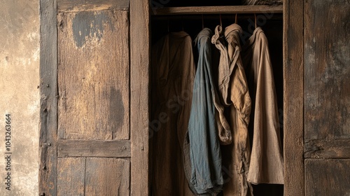 © Pannee, Fototapeta premium Rustic Wardrobe with Hanging Clothes in Natural Light
