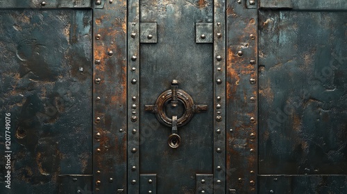 Fototapeta premium Rustic weathered metallic door featuring an ornate handle and keyhole, set...