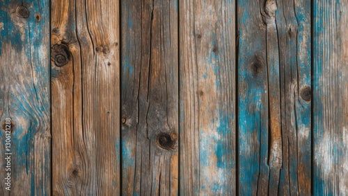 © Giovanni, Fototapeta premium Rustic weathered wooden texture with vibrant blue paint accents and natural grain patterns ideal for backgrounds and design projects