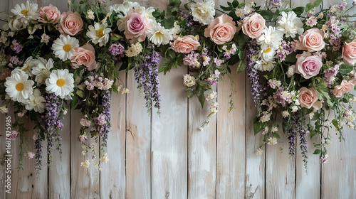 Fototapeta premium rustic wedding maternity backdrop wooden wall floral arch lavender daisies pink roses natural design