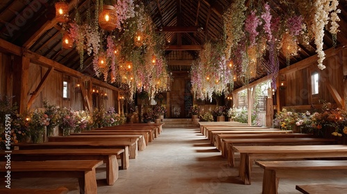 © Banstanks, Obraz premium Rustic wedding venue adorned with vibrant flowers and hanging lights, creating a romantic atmosphere