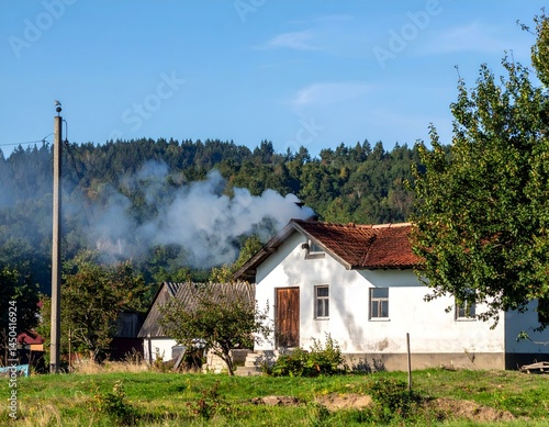 Fototapeta premium Rustic white house with smoke from chimney, idyllic rural landscape.