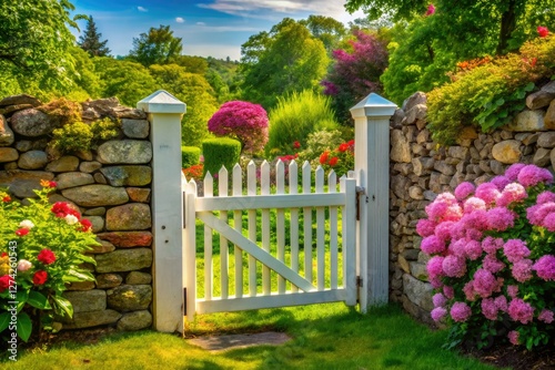 © nick, Fototapeta premium Rustic white picket fence divides a charming countryside landscape, a picturesque architectural photograph.
