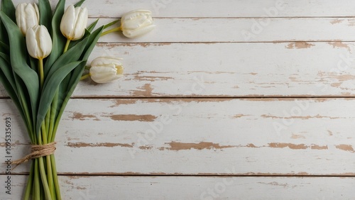 Naklejka premium Rustic white wash painted old wood boards with twine tied bouquet of white tulip flowers flat lay mockup background