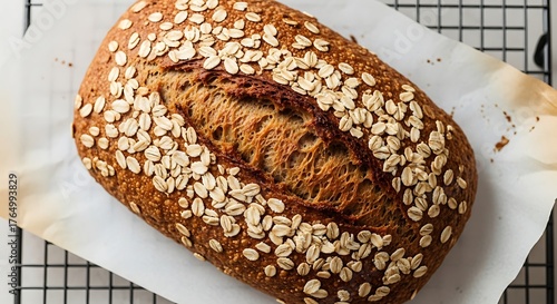 © ALAUDDIN, Fototapeta premium Rustic whole grain bread loaf with oats on a cooling rack