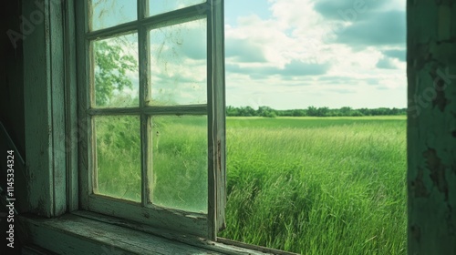 © azi, Fototapeta premium Rustic window view of a grassy field.