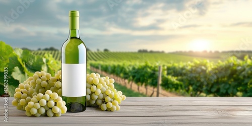 Fototapeta premium Rustic wine scene with bottle and grape bunches